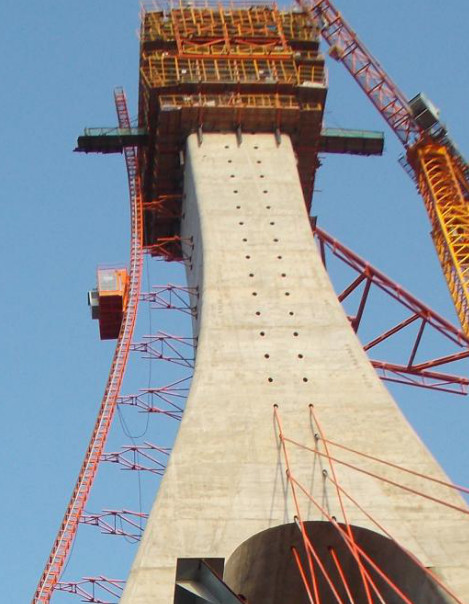1. Two bridge towers and four bridge columns, with a maximum inclination angle of 16 degrees, exceeding the national standard range. One elevator is installed on each side of the bridge columns, two of which are curved and the other two are inclined; After the closure of the two bridge columns, only two curved construction elevators will remain in operation;