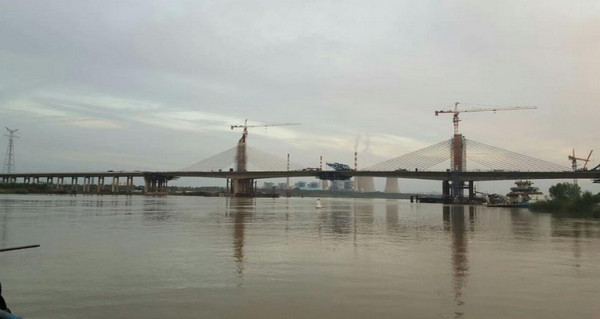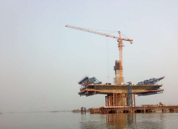 淮南某大桥建设工程,吊装体量选定TC6010-8t塔式起重机,结合桥面结构,塔机采用十字方梁结构和预埋地脚螺栓,解决了基础和各部件安装的问题,后期根据水面风载增设非标附着,保证该工程安全顺利完成。